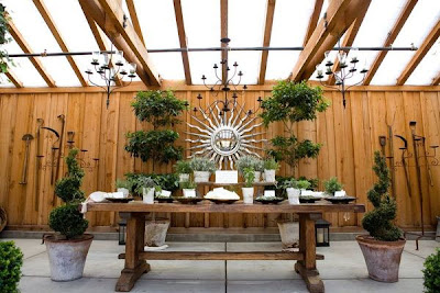 | Mesa sem toalha, guardanapos listrados, arranjos: galhos secos , vasos de louça com rosas vermelhas e velas |